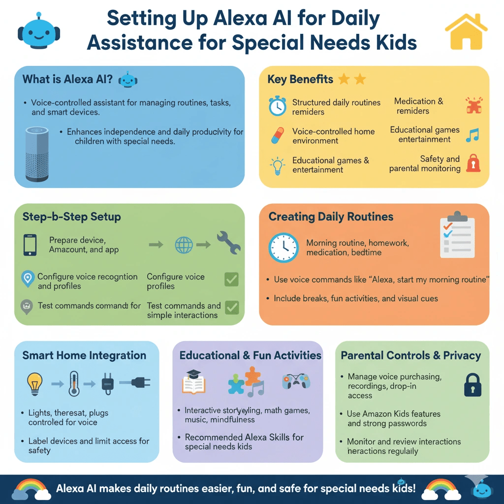 Alexa AI is a versatile tool for enhancing the daily lives of children with special needs. By following this step-by-step guide, parents and caregivers can set up routines, reminders, and smart home integrations that promote independence, safety, and skill development. Combining voice-controlled assistance with educational skills and entertainment options ensures children remain engaged while developing cognitive, motor, and social abilities. Proper privacy and parental controls guarantee a secure and supportive learning environment.