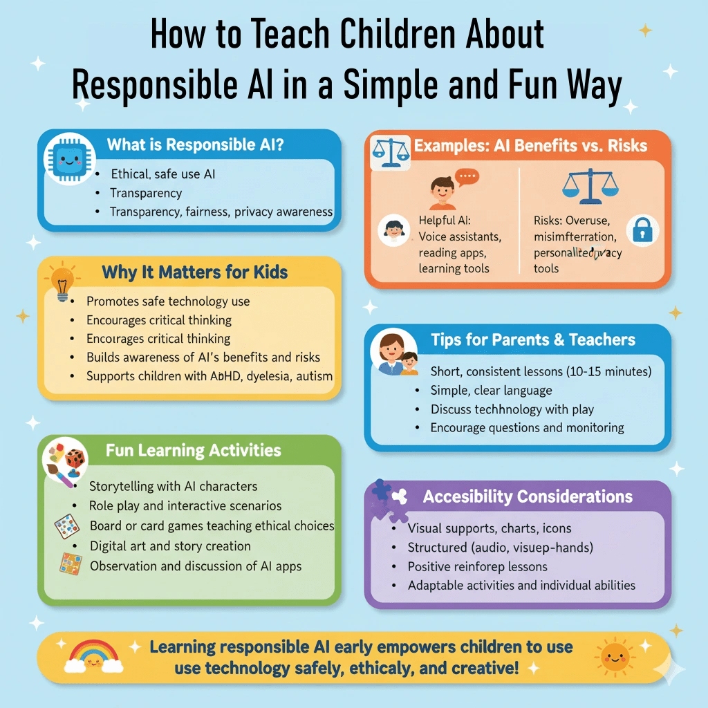 Teaching children about responsible AI is both essential and fun. By using storytelling, games, role play, and real-world examples, parents and teachers can make complex AI concepts accessible, especially for children with special needs. Early education in safe and ethical AI use empowers children to navigate the digital world thoughtfully and responsibly, setting the foundation for a safer and more informed generation.