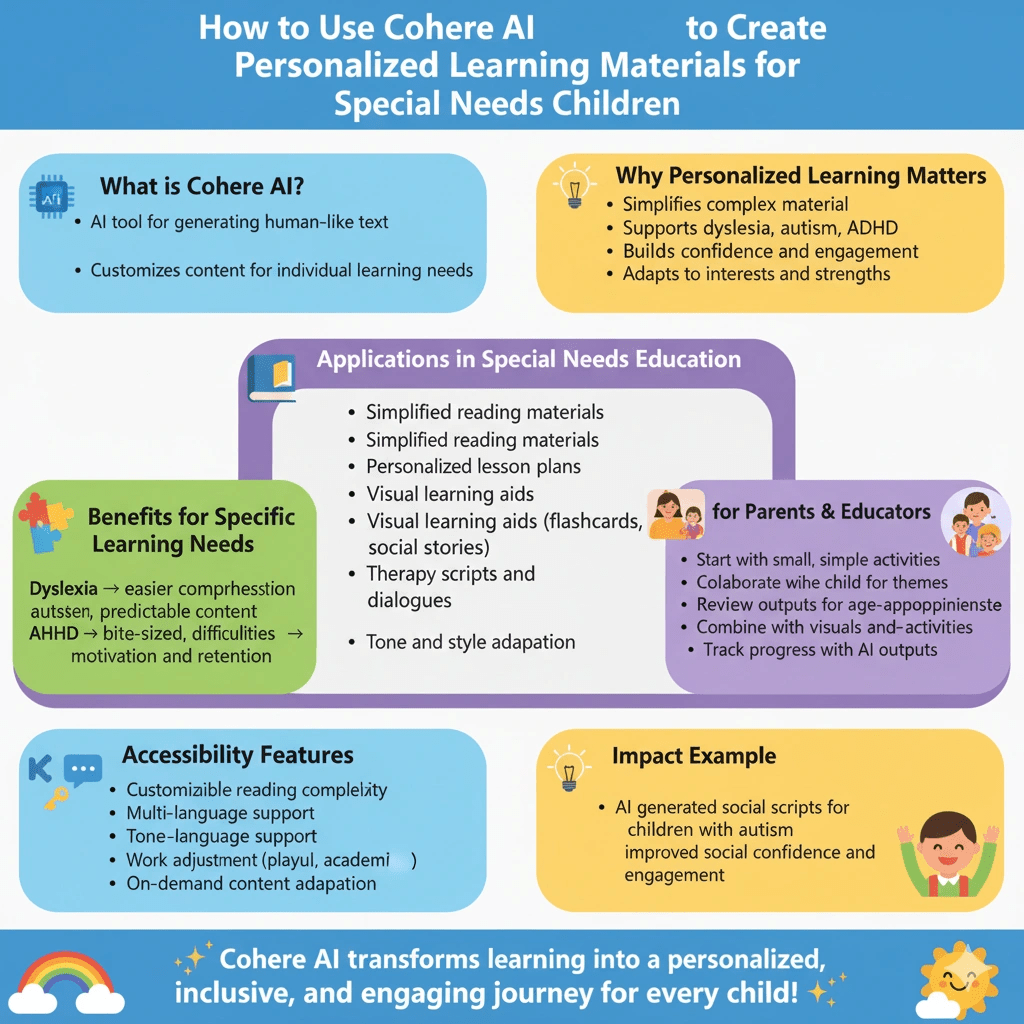 Cohere AI is a powerful ally in creating personalized, inclusive learning materials for special needs children. By simplifying text, adapting tone, and generating engaging content, it helps children with dyslexia, autism, ADHD, and other learning challenges thrive academically and socially. With careful guidance from parents and educators, Cohere AI can transform learning into a more supportive, motivating, and joyful journey.