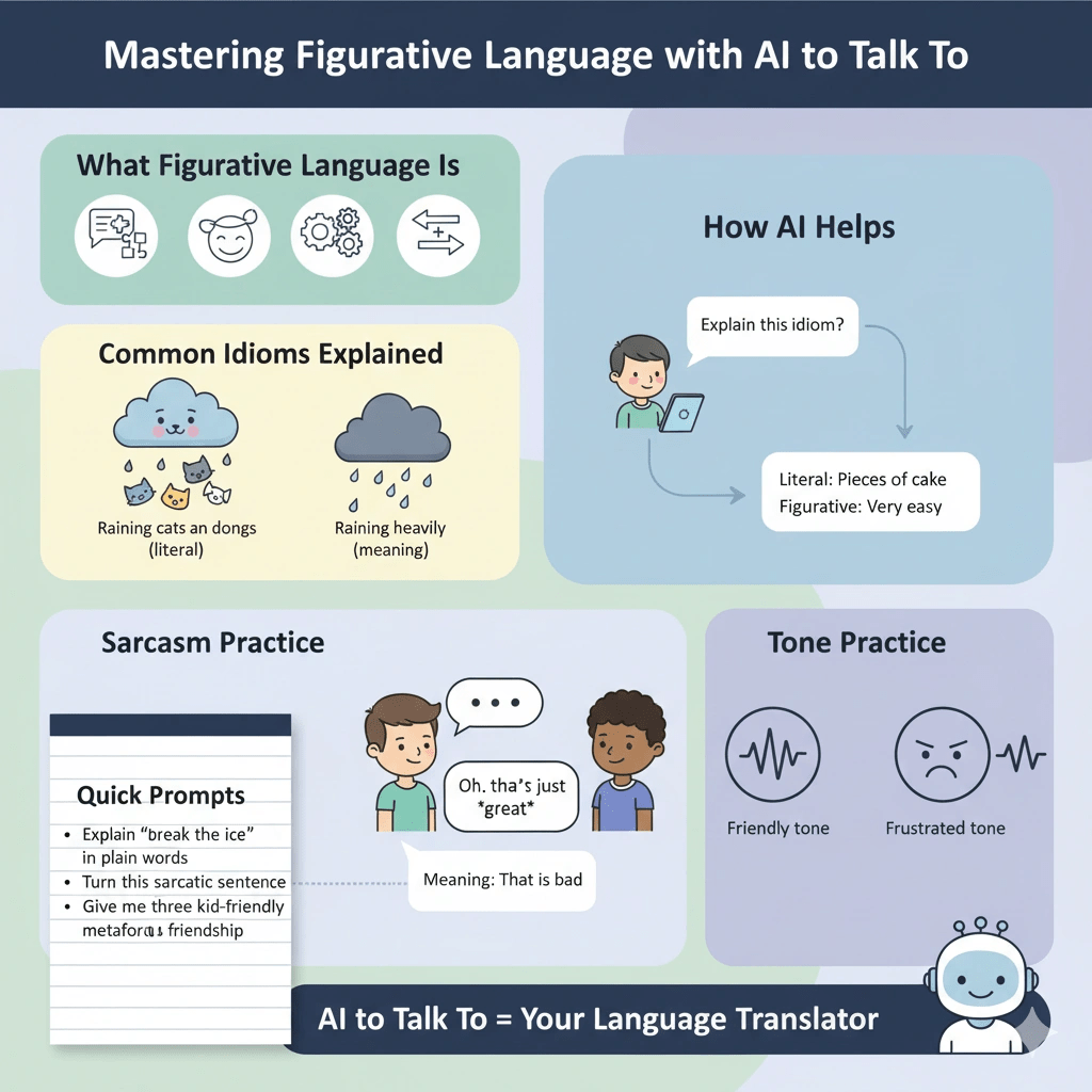 Figurative language is essential for social communication, reading comprehension, and academic success. By using AI to talk to, parents and educators can transform idioms, sarcasm, and metaphors into fun, manageable lessons. This not only builds stronger language skills but also boosts confidence in navigating everyday conversations.