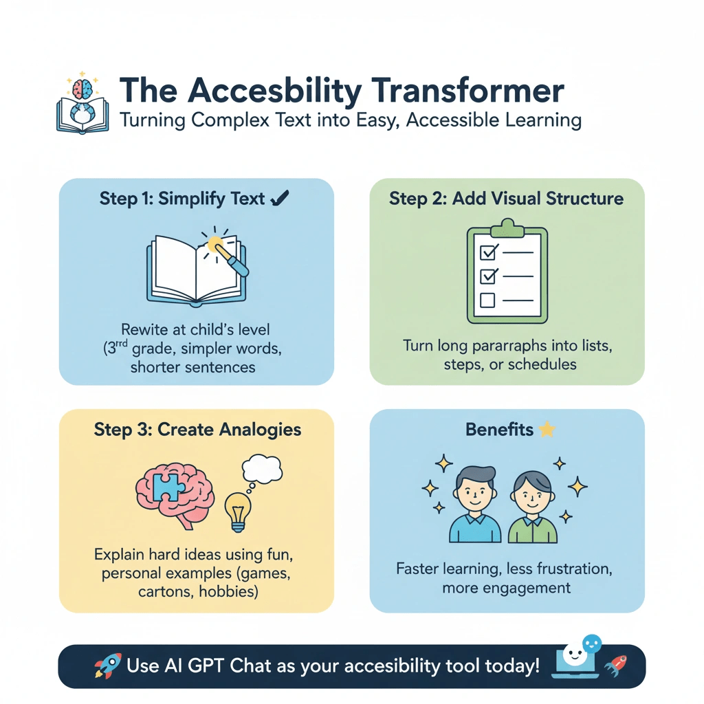 The Accessibility Transformer concept highlights the power of AI GPT Chat to make learning inclusive, simple, and engaging. By simplifying text, creating structure, and using analogies, it ensures that no child is left behind. For parents and educators, it’s not just a tool—it’s a co-pilot in building a more accessible world of learning. 🌍✨