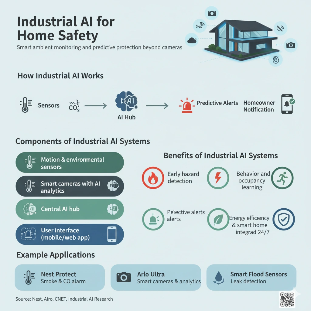 Industrial AI refers to the application of artificial intelligence models traditionally used in industrial environments to optimize operations, predict failures, and enhance decision-making. When applied to home safety, industrial AI systems combine sensor data, IoT devices, and predictive analytics to provide more than just video surveillance.
