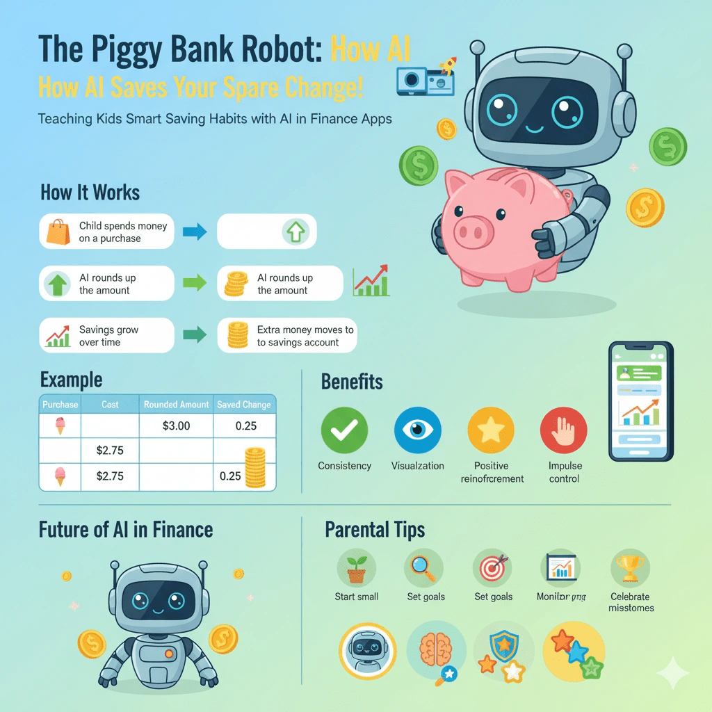 Teaching children the value of saving money is often easier said than done. Traditional piggy banks work for younger kids, but as children grow into tweens and teens, handling money digitally through debit cards or allowance apps becomes the norm. This is where AI in finance offers a smart solution: automated savings apps, often referred to as “Piggy Bank Robots”. These tools use AI-powered rules like “round-ups” to save small amounts of money effortlessly. For parents, this represents a practical way to instill financial habits, while for kids, it creates a fun, visual, and consistent savings journey.