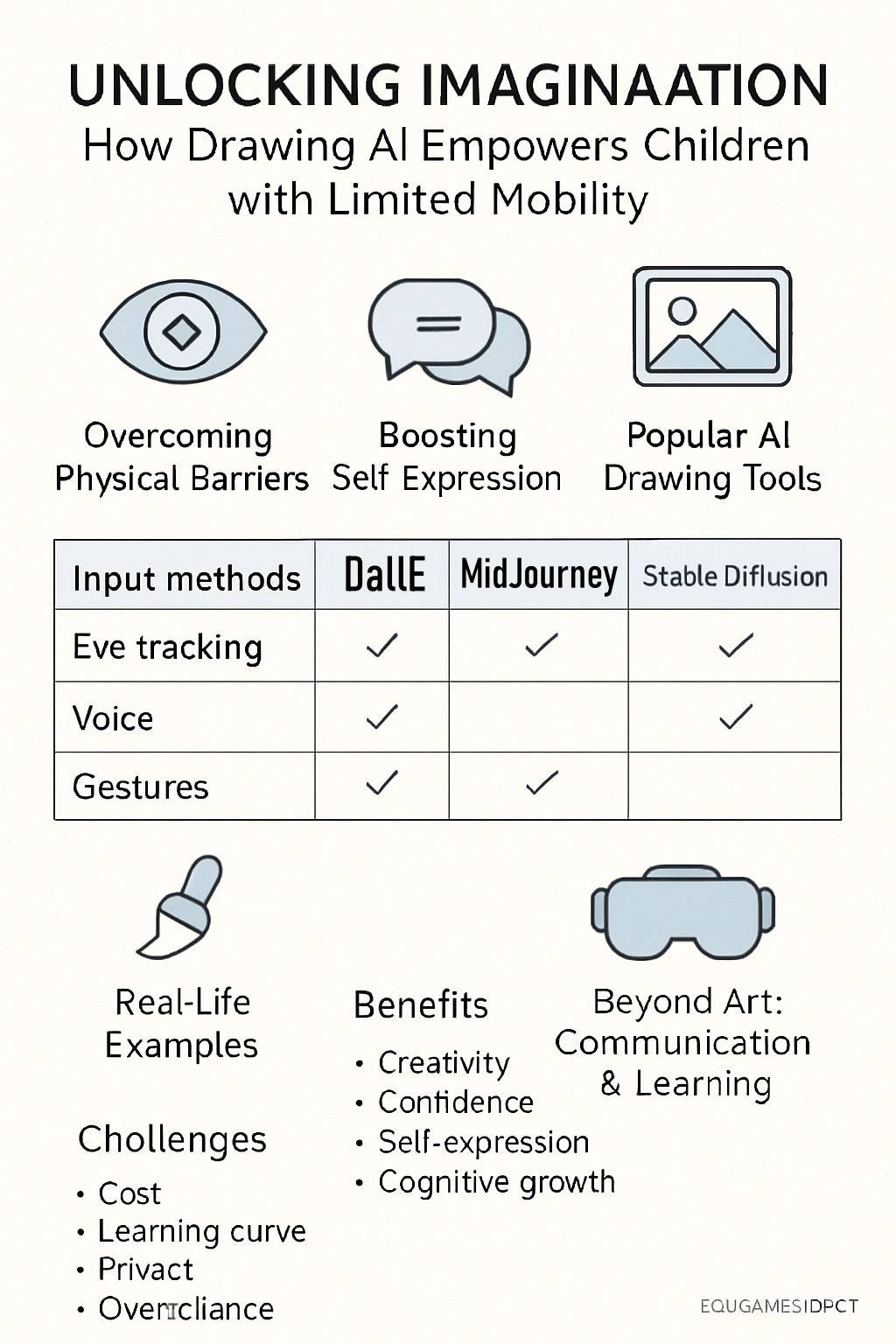 Drawing AI is transforming the way children with limited mobility engage in creative expression. By enabling art creation through eye-tracking, voice commands, or simple gestures, AI tools overcome physical barriers and foster confidence, imagination, and communication. Beyond art, these platforms support learning, social interaction, and emotional growth, providing children with powerful tools to unlock their creativity and express themselves fully.